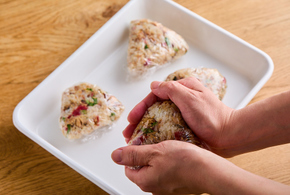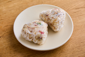 1人2個付けになるようにラップに包んで握ります。