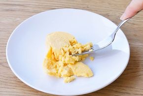 市販のだし巻き卵はやわらかいのでスプーンやフォークで容易につぶせます。食べる方に合わせて、食べやすい形状に崩します。