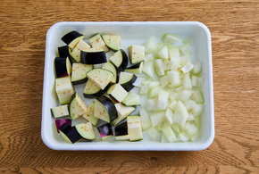 なすは2cm角に切り、ふんわりとラップで包み、電子レンジ(600w)で1分加熱します。玉ねぎは1cm角に切ります。