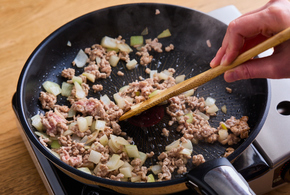 フッ素樹脂加工のフライパンに玉ねぎを入れて中火で炒めます。透き通ってきたら、ひき肉を加え、2分ほど炒めます。