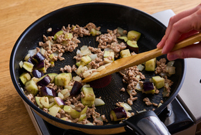 ひき肉の色が変わったら、なすを加え、全体になじむように炒めます。
