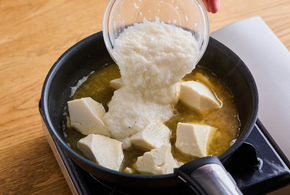 小さめのフライパンにAを入れ、豆腐をスプーンで一口大にすくって加えます。中火で熱し、煮立ってきたら長いもを流し入れます。