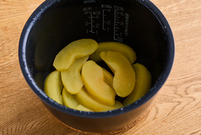炊飯器にりんご、水を入れて通常炊飯します。炊飯が終わったら取り出します。